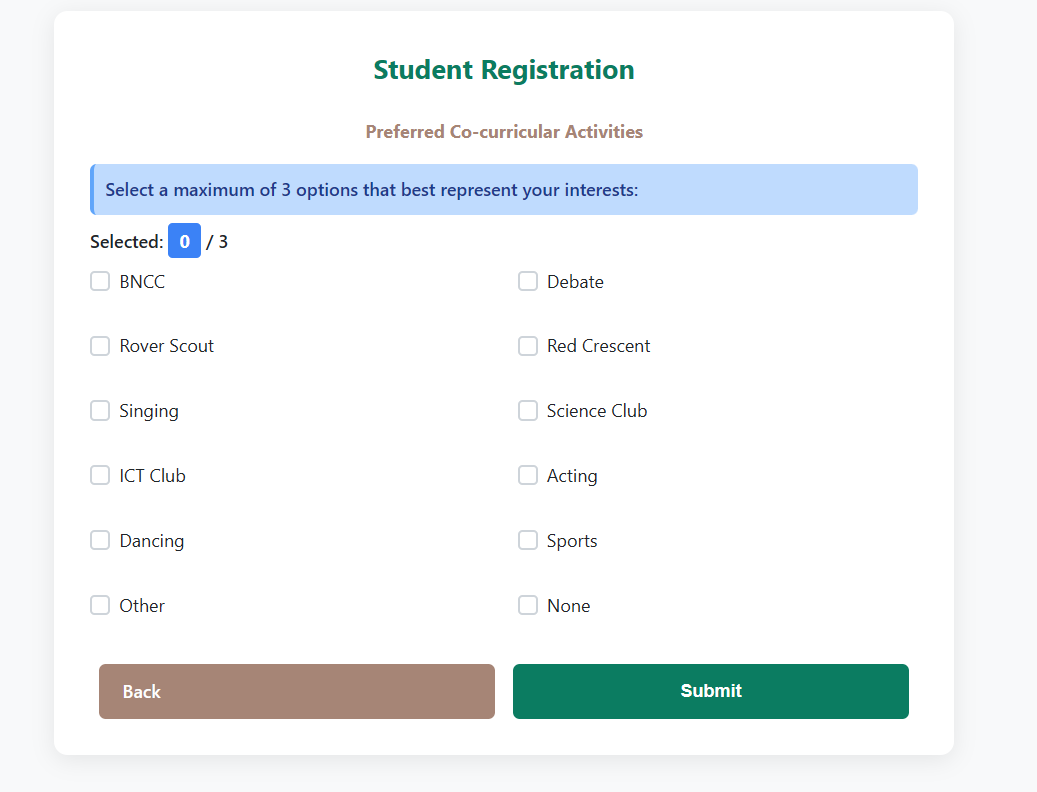 সর্বোচ্চ ৩ টি সহপাঠক্রম বিষয়ের নাম নির্বাচন করা যাবে।