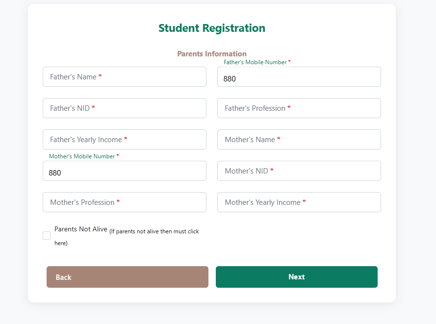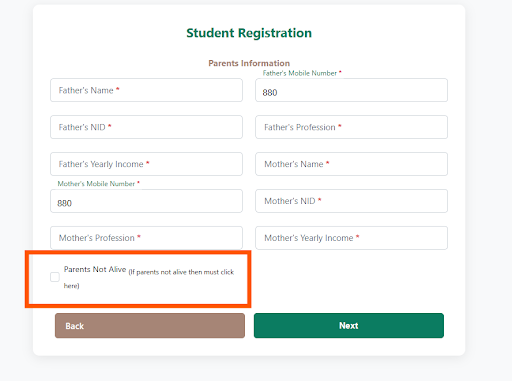 অভিভাবক কেউ না থাকলে বা অন্য কাউকে অভিভাবক করতে চাইলে Parents Not Alive চেকবক্সে টিক দিন।